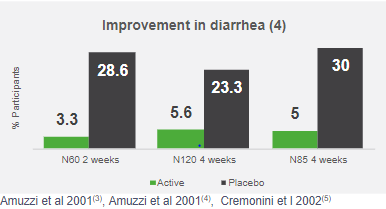 54% reduction of children with gastroenteritis experiencing diarrhea episodes compared with placebo (double blind, placebo controlled randomized trial with 124 children, p>0.05)