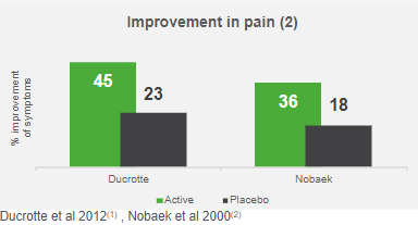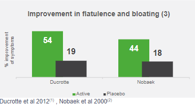52% reduction of abdominal pain and 78% estimated treatment effectiveness in IBS patients (double blind placebo-controlled trial with 214 participants, p<0.05). >50% reduction of bloating in 44% of IBS patients (double blind placebo-controlled trial with 60 participants, p<0.05)